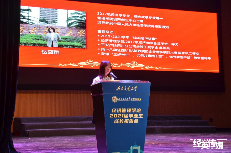 国歌奏唱完毕,执行院长郭强致辞。他首先代表在外出差的学院党委书记王斌以及学院党政领导班子对圆满完成学业的同学表示衷心祝贺,对不辞辛苦、默默付出的老师和家长表示诚挚感谢。郭强指出,此次毕业生成长报告会不仅是对过去的总结,更是对未来的展望。在中国共产党成立一百周年之际,毕业生们不仅怀揣着自己的梦想,也承载着党和国家的期许,应当肩负起复兴祖国的重任。他向毕业生们提出三点希望:一是要坚定理想信念,勤奋耕耘,不断进取,追求卓越;二是要勤于学习,勇于实践,不断提高自身素质,努力成才;三是要肩负责任,勇于担当。他强调,毕业同学们要心怀“竢实扬华,自强不息”的交大精神,传承“格物致知,和合共进”的经管院训,在崭新的未来征途中,书写更为精彩的人生篇章。